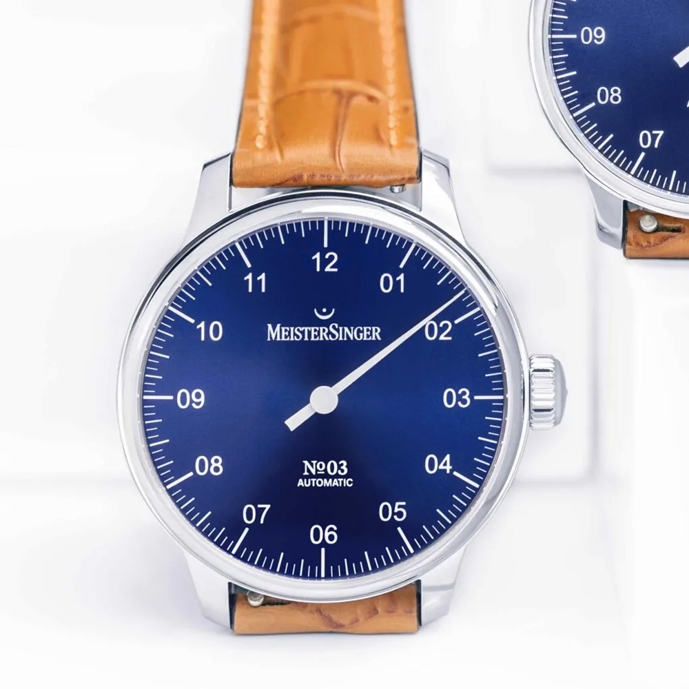 Die N° 03 ist ein echter MeisterSinger-Klassiker. In ihrer Gestalt zeigen sich alle ästhetischen Prinzipien, die bis heute die gesamte Kollektion prägen: die sachliche Typografie mit durchgehend zweistelligen Stundenindizes, die umlaufende Fünf-Minuten-Einteilung und vor allem der einzelne, nadelspitze Stundenzeiger.